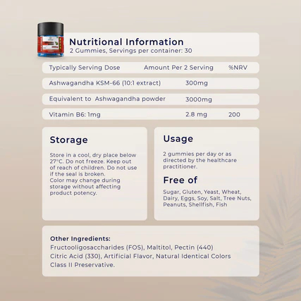 A mixture of glucose syrup, sucrose, water, maltodextrin, ashwagandha extract (10:1), pectin (pectin, sugar), apple juice concentrate, citric acid (acidity regulator), sodium citrate (acidity regulator), natural flavor, surface treatment agents (vegetable oil, carnauba wax), black carrot juice concentrate, and vitamin B6 (pyridoxine hydrochloride).