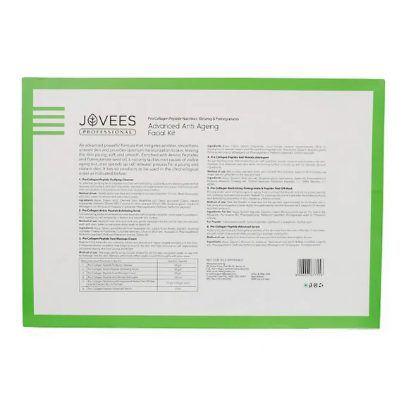 How To Use: Jovees Professional Pro Collagen Peptide Purifying Cleanser: Gently apply over face and massage in circular motion for 3 to 5 minutes. Wash thoroughly with plain water or remove with wet cotton swabs. Jovees Professional Pro Collagen Active Peptide Exfoliating Scrub: Apply all over face and neck and gently massage for 2 minutes. Wash thoroughly with plain water or remove with wet cotton swabs. Jovees Professional Pro Collagen Peptide Face Massage Cream: Use cream along with plain water or raw milk. Massage gently into the skin for 20 minutes using circular strokes. Wash thoroughly with plain water or remove with wet cotton swabs. Jovees Professional Pro Collagen Peptide Anti Wrinkle Astringent: Wet a cotton pad with a toner, use fingertips to lightly tab on the face and neck. Leave it on for 3 minutes. Jovees Professional Pro Collagen Revitalizing Pomegranate And Peptide Peel Off Mask: In a bowl, add the powder and the gel. Mix well for approximately 2 minutes till it becomes a homogeneous paste. Apply paste evenly on face and neck. Leave on for 25 minutes and then remove it. Jovees Professional Pro Collagen Peptide Advanced Serum: Apply thin dots of serum all over your face and then blend lightly all over. Legal Disclaimer: Product images are for illustrative purposes only. Images/packaging/ labels may vary from time to time due to changes made by the manufacturer's manufacturing batch and location. The product description is for information purposes only and may contain additional ingredients.