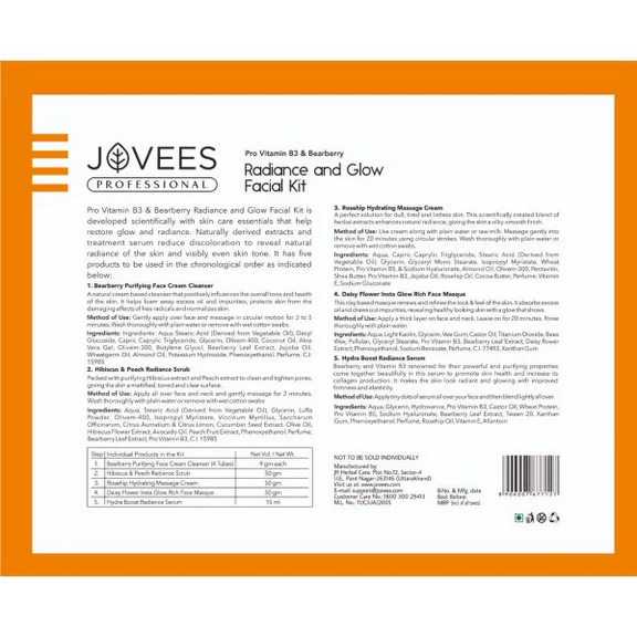 - Pro Vitamin B3 And Bearberry Radiance and Glow Facial Kit is developed scientifically with skin care essentials which help to restore glow and radiance. Naturally derived extracts and treatment serum reduce discoloration to reveal natural radiance of the skin and visibly evens out the skin tone. It has five products to be used in the chronological order as indicated below.